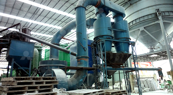 第二階段:磨粉破碎后的方解石小塊物料經(jīng)提升機送至料倉,再經(jīng)振動給料機將其均勻定量的送入磨機研磨室內(nèi)進行研磨。