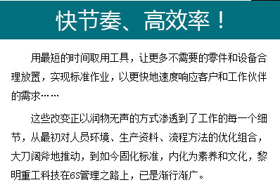 這些改變正以潤物無聲的方式滲透到了工作的每一個(gè)細(xì)節(jié),從開始對人員環(huán)境、生產(chǎn)資料、流程方法的優(yōu)化組合,大刀闊斧地推動,到如今固化標(biāo)準(zhǔn),內(nèi)化為素養(yǎng)和文化,黎明重工科技在6S管理之路上,已是漸行漸廣。