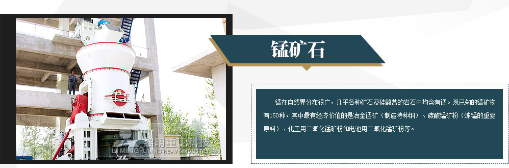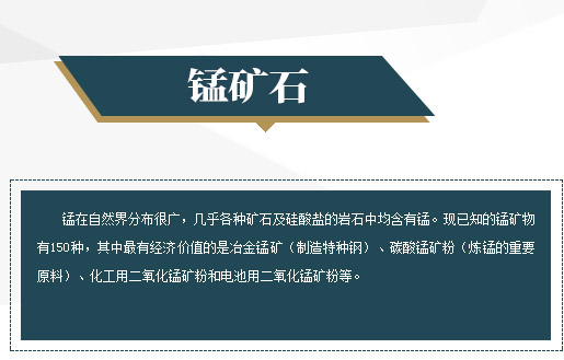 錳在自然界分布很廣,幾乎各種礦石及硅酸鹽的巖石中均含有錳?,F(xiàn)已知的錳礦物有150種,其中有經(jīng)濟(jì)價(jià)值的是冶金錳礦(制造特種鋼)、碳酸錳礦粉(煉錳的重要原料)、化工用二氧化錳礦粉和電池用二氧化錳礦粉等。