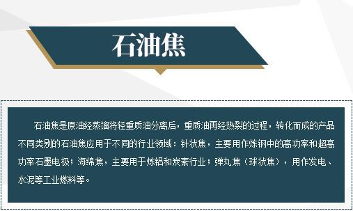 石油焦是原油經(jīng)蒸餾將輕重質(zhì)油分離后,重質(zhì)油再經(jīng)熱裂的過(guò)程,轉(zhuǎn)化而成的產(chǎn)品不同類(lèi)別的石油焦應(yīng)用于不同的行業(yè)領(lǐng)域:針狀焦,主要用作煉鋼中的高功率和大功率石墨電極;海綿焦,主要用于煉鋁和炭素行業(yè);彈丸焦(球狀焦),用作發(fā)電、水泥等工業(yè)燃料等。